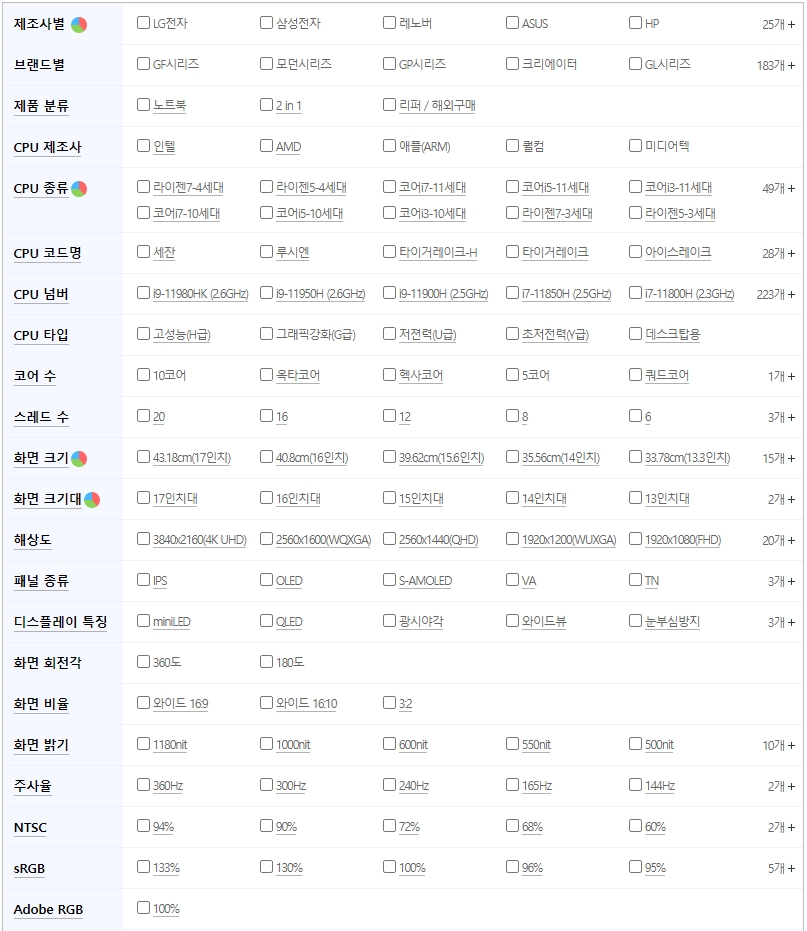 다나와 좌측 카테고리에서 노트북을 선택하면 노트북에 대한 다양한 옵션 확인이 가능합니다. 여기서 자신이 구매하고자 하는 노트북의 스펙을 선택할 수가 있는데요 제조사, 브랜드, CPU 제조사, CPU 종류, 코어수, 스레드 수, 패널 종류, 무게, 베터리 용량, 색상 까지 다양한 옵션을 선택할수가 있어서 자신의 입맛에 맞는 옵션 선택해서 노트북을 검색할 수가 있습니다.